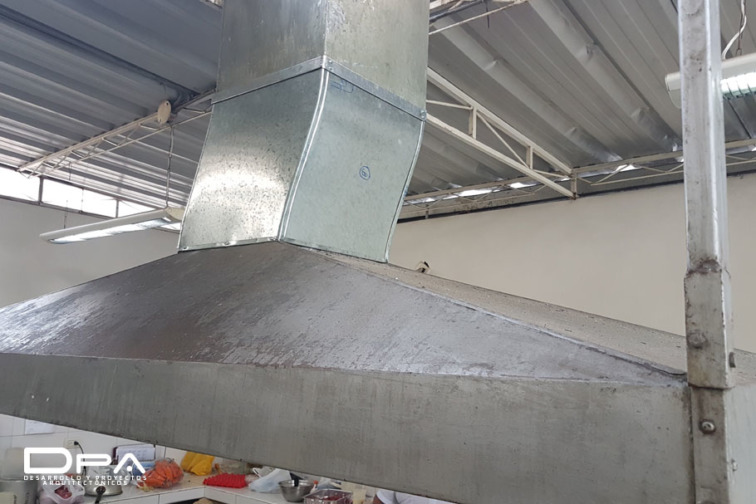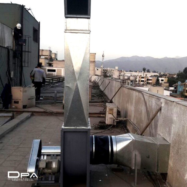 Trabajo de diseño y ejecución de proyecto de instalación industrial de circuito de ventilación y extracción de monóxido de cocina principal de la clínica. Diseño de ductos, uso de drywall, cálculo del volumen de aire necesario para ventilación de cocina. Se monta campana, ductos de extracción motores, tableros eléctricos, de transferencia e instalación a cubierta 4 plantas más sobre área de trabajo.